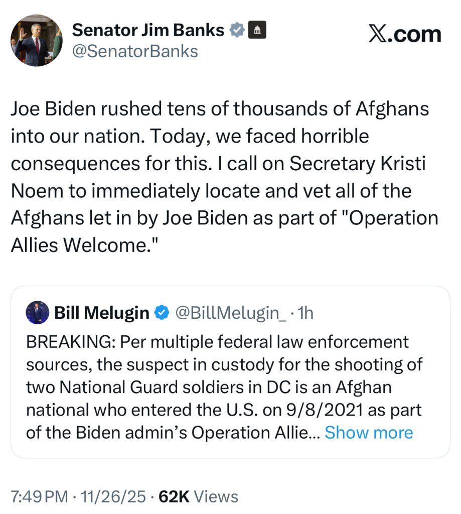 Following the shooting, Senator Banks called on DHS Secretary Noem to immediately locate and vet all Afghan nationals let in by the Biden Administration during “Operation Allies Welcome.”