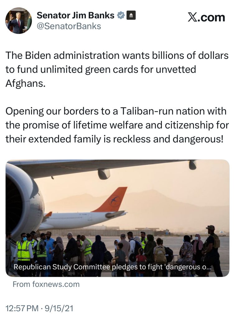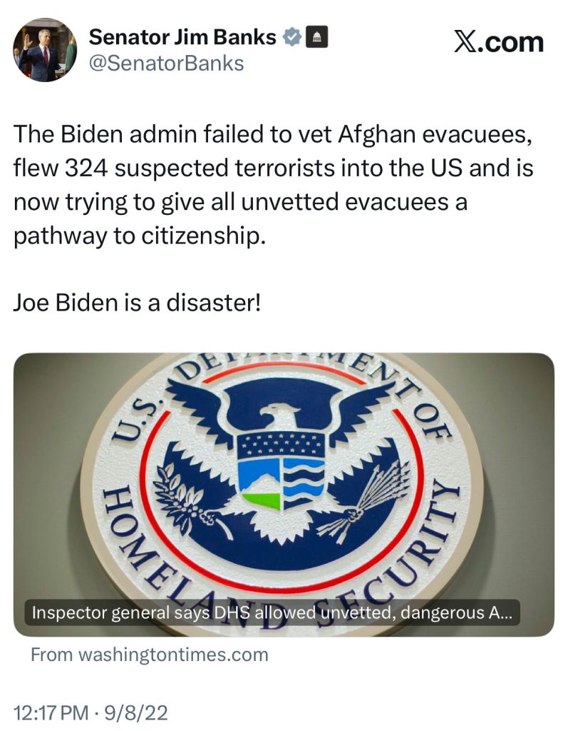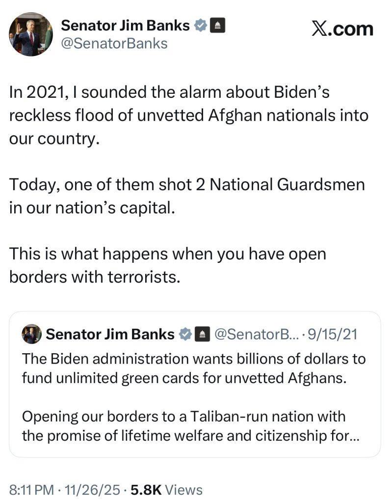 WASHINGTON, D.C, – In 2021, Senator Jim Banks (R-Ind.) sounded the alarm about the Biden Administration’s admission of unvetted Afghan nationals into the United States during “Operation Allies Welcome.” Earlier today, two National Guardsmen were tragically shot by one of those Afghan nationals.